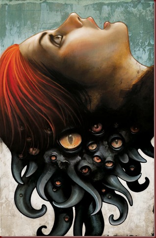 Então vi o bruxulear lívido de uma luz pálida, e ouvi o marulho insidioso de águas escuras. Novamente estremeci, porque eu não havia gostado das coisas que a noite tinha trazido, e desejava amargamente que nenhum antepassado tivesse me obrigado a este rito primitivo. À medida que os degraus e a passagem ficavam mais largos, eu ouvi outro som, o lamento agudo de uma flauta débil; e de repente surgiu na minha frente a paisagem ampla de um mundo interior: uma costa fungosa e vasta, iluminada por uma coluna que vomitava uma doentia chama esverdeada, e banhada por um largo rio oleoso que fluía dos abismos assustadores e desconhecidos para se juntar à baía negra do oceano antiqüíssimo.